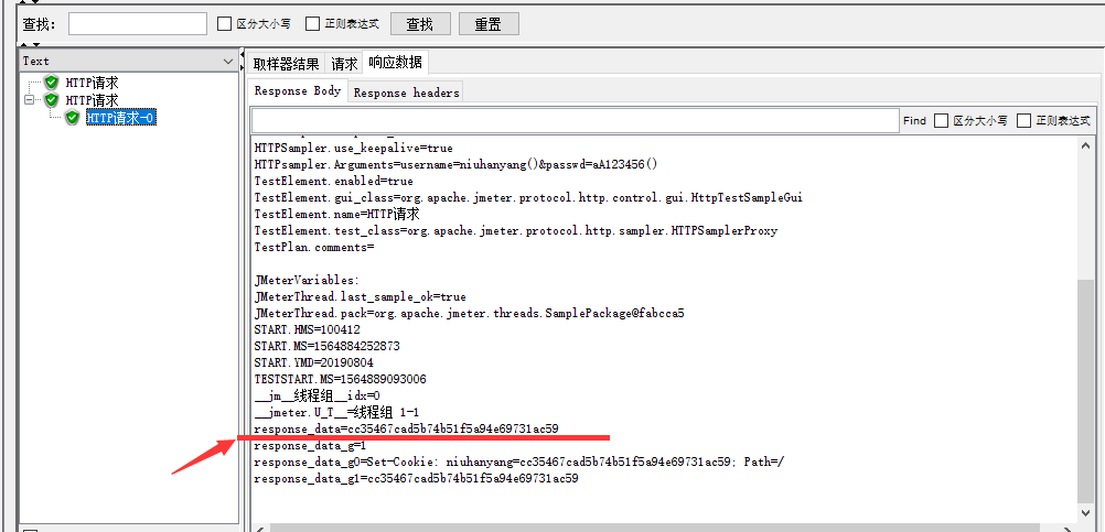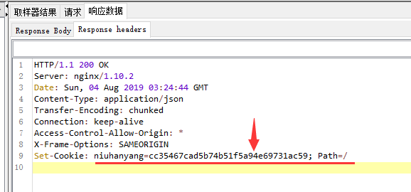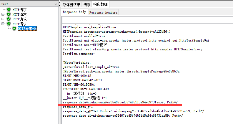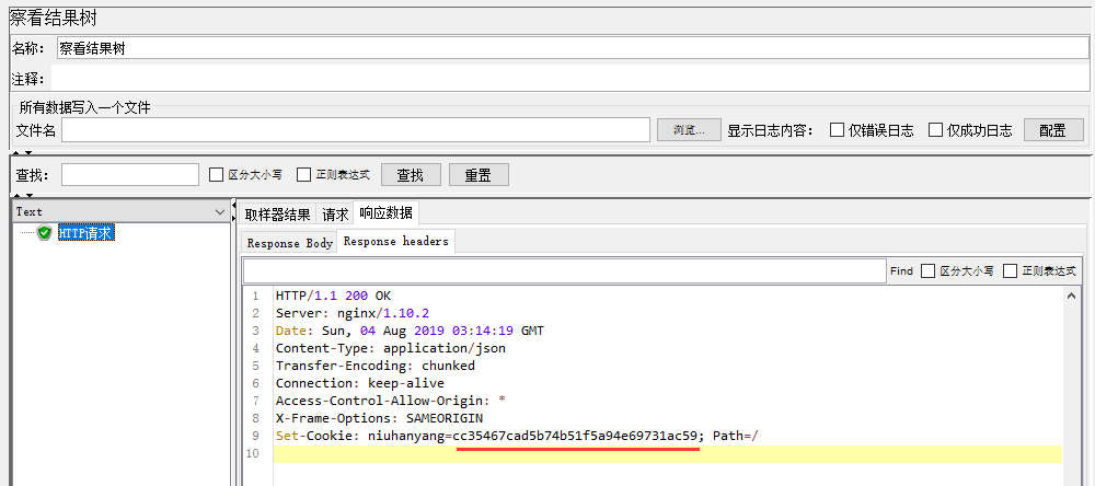 接着,设置一个察看结果树,然后执行,得到响应数据,下图中的cookie即我们需要提取的数据: