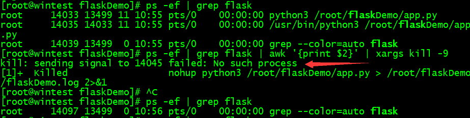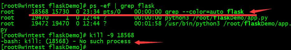 出现这个错误,是因为我们通过 ps -ef | grep flask 查找到的所有 flask 进程中,有一条是包含 grep 本身的进程行,这一条进程行是不能被杀掉的,否则就会报错,比如下面这样: