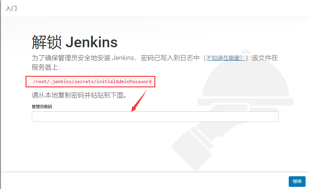 根据界面的提示,到路径 /root/.jenkins/secrets/initialAdminPassword 下找出密码,然后复制填入即可。