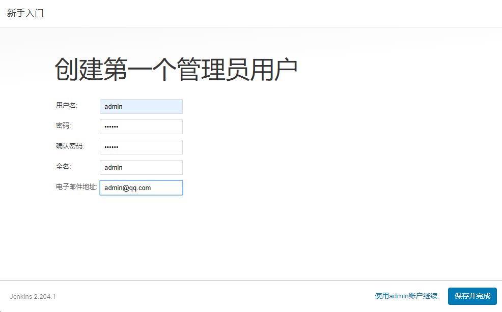 填写信息之后,可以选择 使用admin账户继续 ,也可以直接选择 保存并完成,根据自己情况选择。
