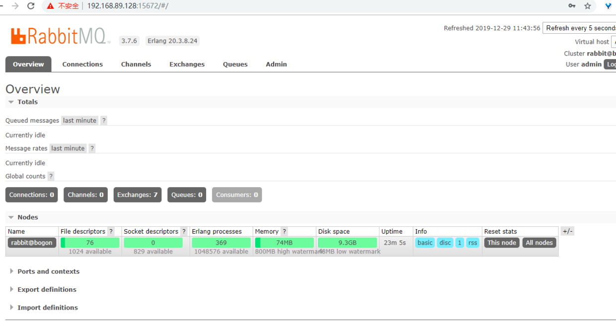 在Windows中输入地址进行访问:http://ip地址:15672/,可以看到RabbitMQ的控制台管理界面。