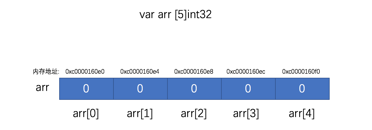假如我们声明一个长度为5的数组var arr [5]int,我们来看看这个数组在内存中的结构是怎么样的。
