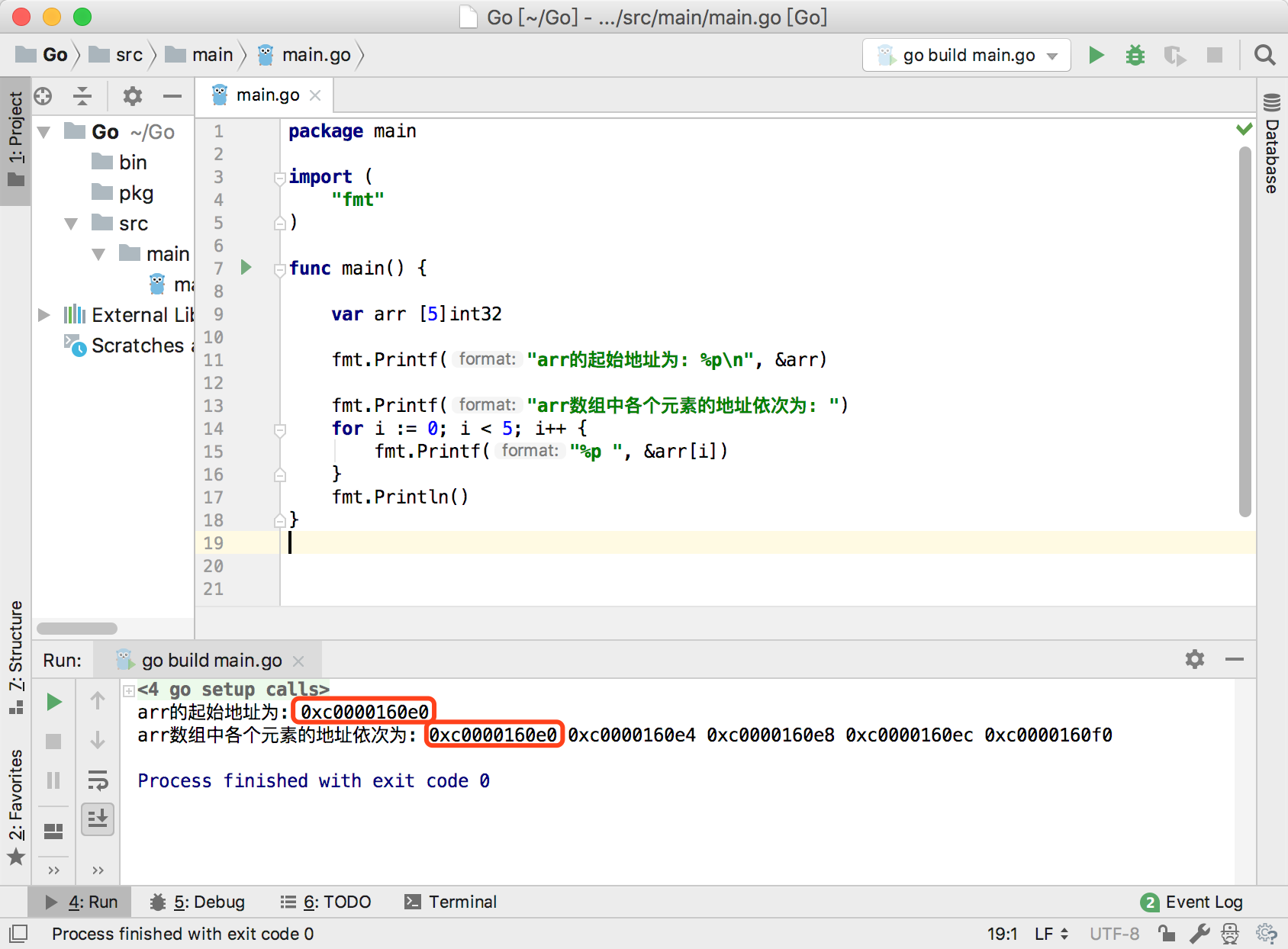 上图就是一个Go语言数组在内存的结构,在这个arr数组中,由于我们声明的是int32类型,所以数组中的每个元素在内存中占用的字节数是32/8=4字节,通过arr数组每个元素16进制地址我们可以发现,数组中后一个元素的地址比前一个元素的地址大4个字节,这个4字节正好是int32类型元素占用的内存大小,由此我们也能得出结论:数组中元素的内存地址是连续的;当声明数组时所有的元素都会被自动初始化为数组类型的默认值(int类型的默认值是0,所以arr中每个元素的默认值都是0);数组的下标识从0开始的。数组arr的地址就是数组第一个元素(下标为0的元素)的地址,通过下图打印arr的地址和arr[0]的地址就可以证明