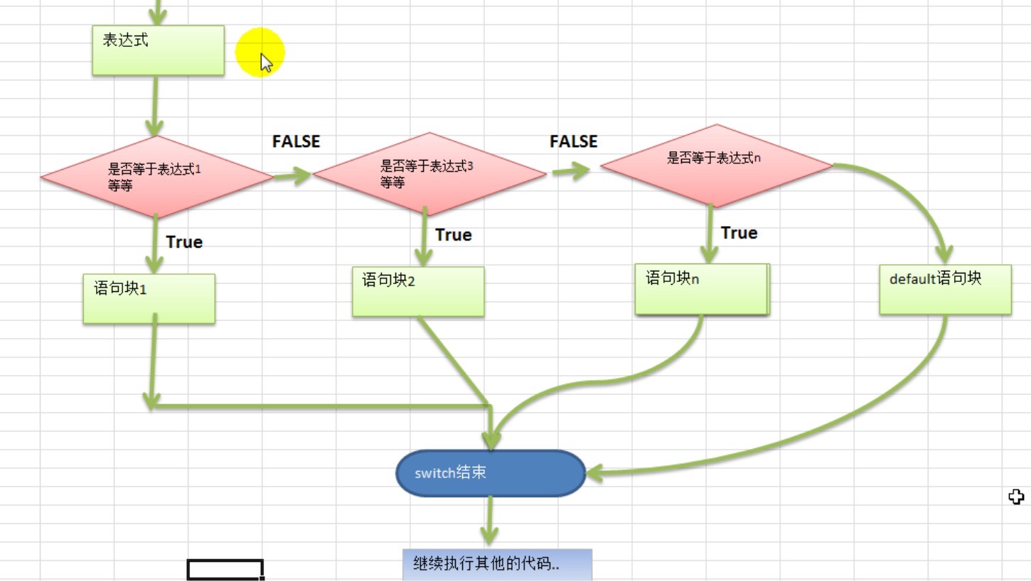 1、 switch的执行流程是,先执行表达式,得到值,然后和case的表达式进行比较,如果相等,就匹配到,然后执行对应的case的语句块,然后退出switch控制,如果一个都匹配不到,则执行default。