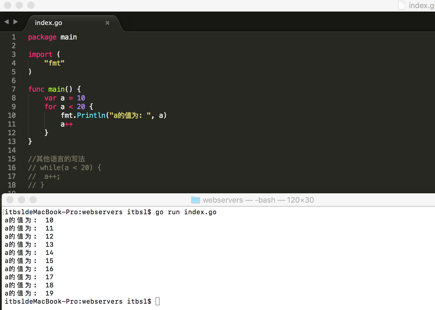 Go语言的关键字也可以实现其它编程语言里while的功能,比如定义一个变量a,当a>=20时就跳出循环,否则一直循环下去。