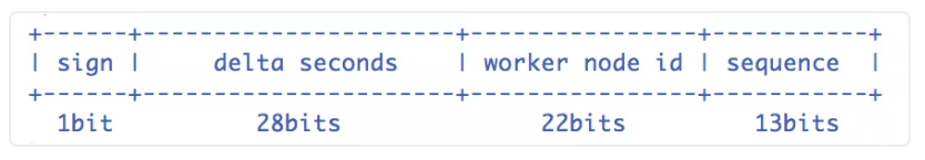 1、 第一个部分是 1 个 bit:0, 这个是无意义的。因为二进制里第一个 bit 位如果是 1,那么都是负数,但是我们生成的 id 都是正数,所以第一个 bit 统一都是 0。