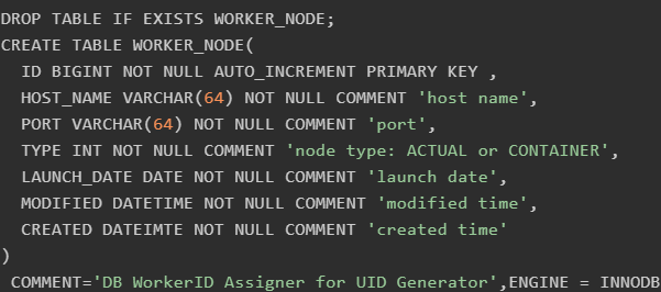 worker id 接下来说一下UidGenerator是如何给worker id赋值的,搭建UidGenerator的话,需要创建一个表: