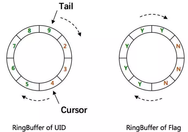 CachedUidGenerator是UidGenerator的重要改进实现。它的核心利用了RingBuffer,如下图所示,它本质上是一个数组,数组中每个项被称为slot。UidGenerator设计了两个RingBuffer,一个保存唯一ID,一个保存flag。RingBuffer的尺寸是2^n,n必须是正整数: