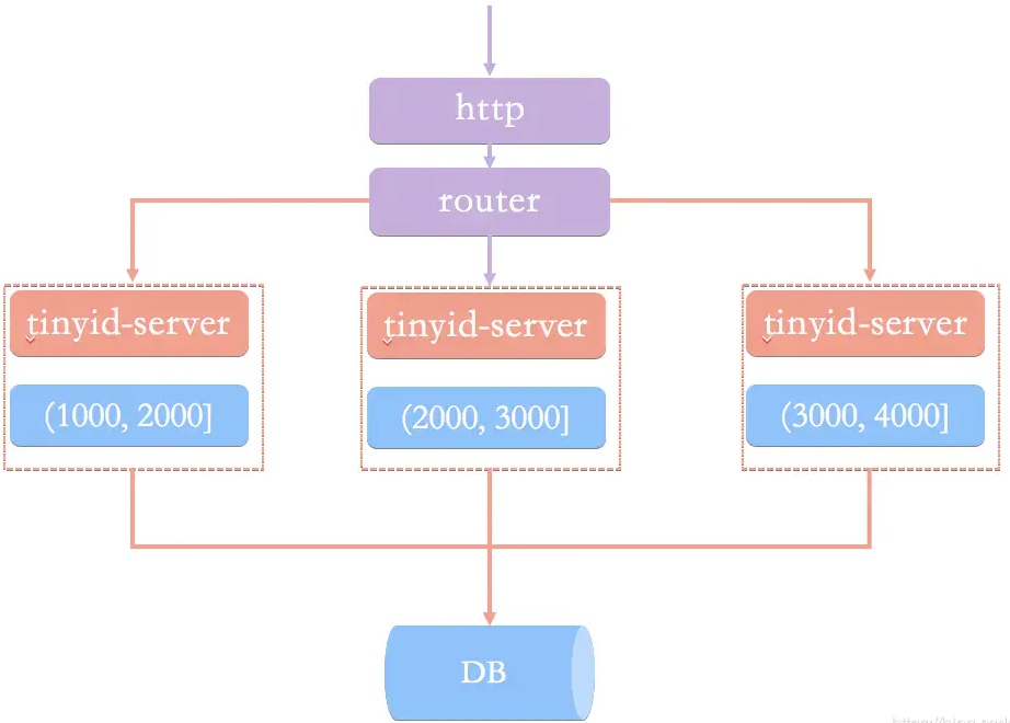 Tinyid教程 的原理非常简单,通过数据库表中的数据基本是就能猜出个八九不离十,就是经典的segment模式,和美团的leaf原理几乎一致。原理图如下所示,以同一个bizType为例,每个tinyid-server会分配到不同的segment,例如第一个tinyid-server分配到(1000, 2000],第二个tinyid-server分配到(2000, 3000],第3个tinyid-server分配到(3000, 4000]: