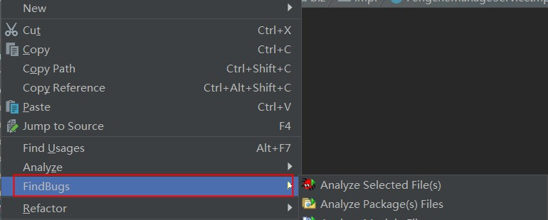 Idea自带的检查工具已经很强大,如有需要也可以加上Alibaba Java Coding Guidelines的代码检查工具,但是,说白这些工具其实更多的是规范性检查,如果需要更深入的去检查异常,可以使用此插件~ 右键点击文件,包或者工程,会出现如下界面