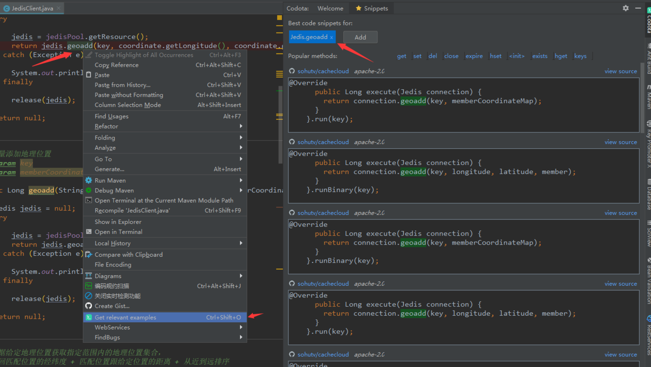 比如我想知道jedis.geoadd方法的参考使用,只需要光标定位在geoadd上,然后右键选择菜单Get relevant examples或者使用快捷键Ctrl + Shift + O就可以快速搜索出来很多示例,非常方便。
