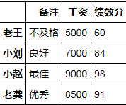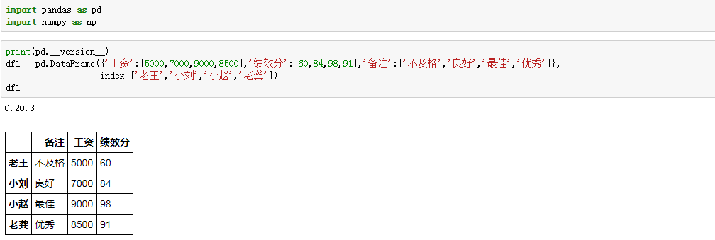 df1 = pd.DataFrame({'工资':[5000,7000,9000,8500],'绩效分':[60,84,98,91],'备注':['不及格','良好','最佳','优秀']},