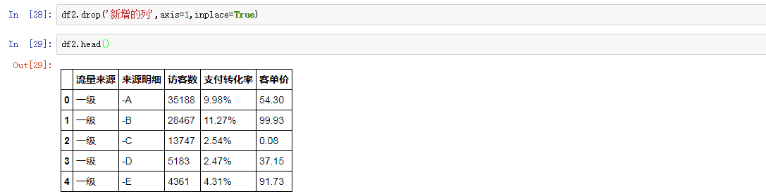 我们用drop函数制定删除对应的列,axis = 1表示针对列的操作,inplace为True,则直接在源数据上进行修改,否则源数据会保持原样。