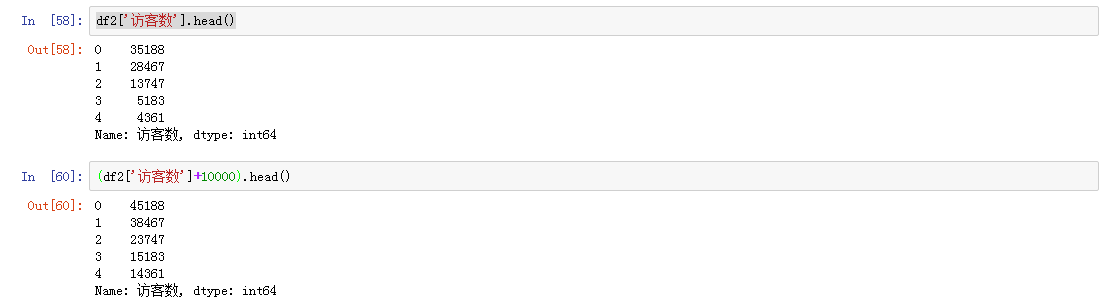只需要选中访客数所在列,然后加上10000即可,pandas自动将10000和每一行数值相加,针对单个值的其他运算(减乘除)也是如此。