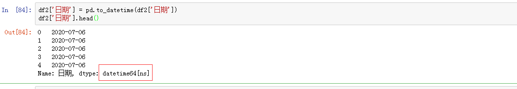 2019-8-3赋值给新增的日期列,然后用to_datetime()函数将字符串类型转换成时间格式: