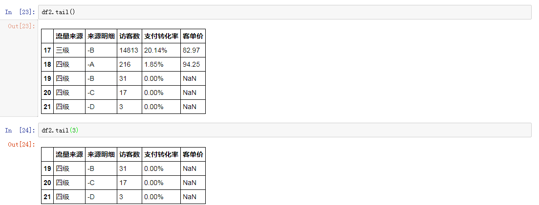很多时候我们想要对数据内容做一个总览,用df.head()函数直接可以查看默认的前5行,与之对应,df.tail()就可以查看数据尾部的5行数据,这两个参数内可以传入一个数值来控制查看的行数,例如df.head(10)表示查看前10行数据。