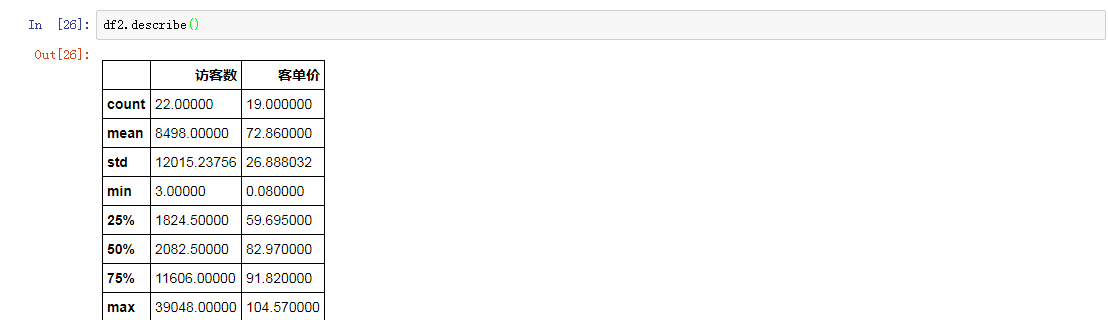 df.describe() 快速计算数值型数据的关键统计指标,像平均数、中位数、标准差等等。