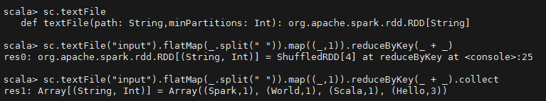 val tuples = sc.textFile(args(0)).flatMap(_.split(" ")).map((_, 1)).reduceByKey(_ + _).sortBy(_._2).collect()