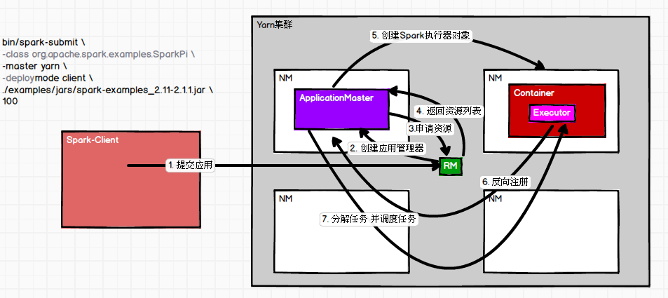 重点:在RM中 通过ApplicationMaster隔离Driver跟RM,在NM中 通过Container 来隔离NM跟Task . 细节调度图如下: