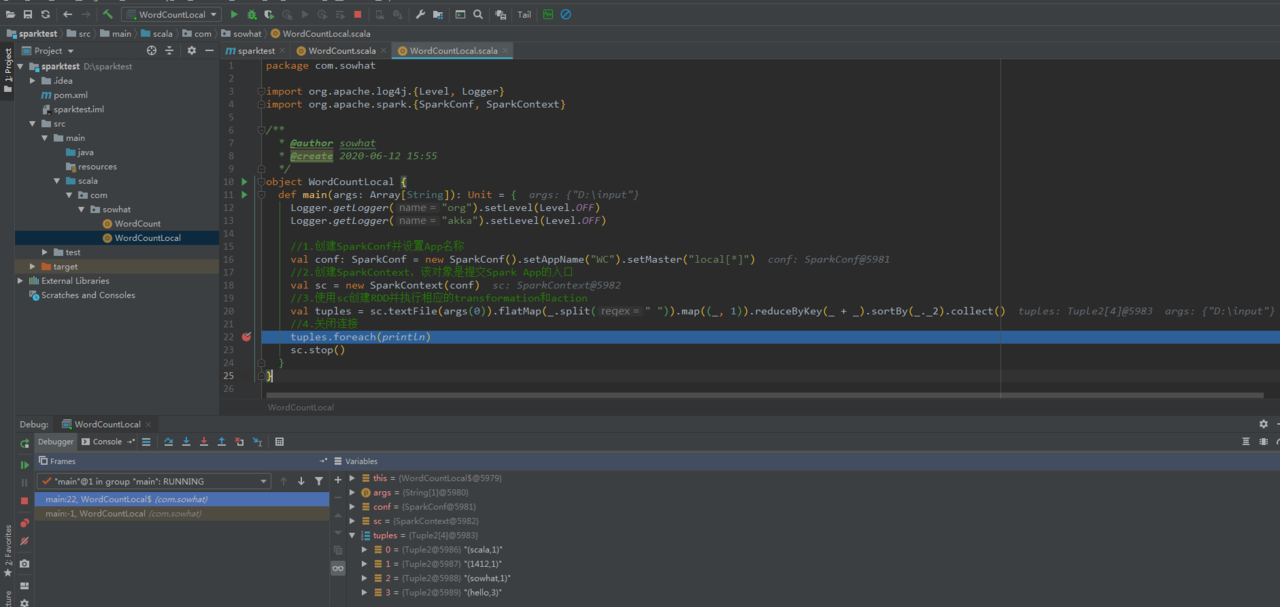 本地Spark程序调试需要使用local提交模式,即将本机当做运行环境,Master和Worker都为本机。运行时直接加断点调试即可。如下: 创建SparkConf的时候设置额外属性,表明本地执行: