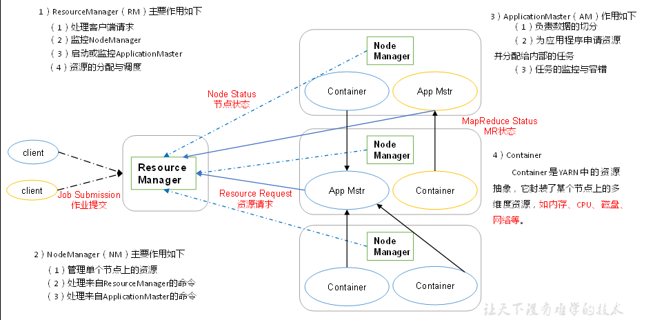AppMaster的启动, AppMaster启动后通知RM,然后RM负责找若干个NM,在每个NM中开辟Container来给任务分配资源, 这些container反向注册到Appmaster中 Appmaster来关联这些任务。 核心思想就是引入了Yarn来负责资源的的调度,细节部分见上图。