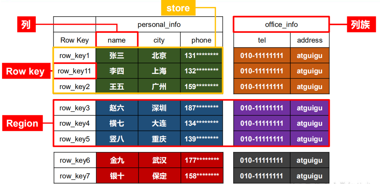 面向列存储的数据库,所以一个行中的数据可以分布在不同的服务器上。
