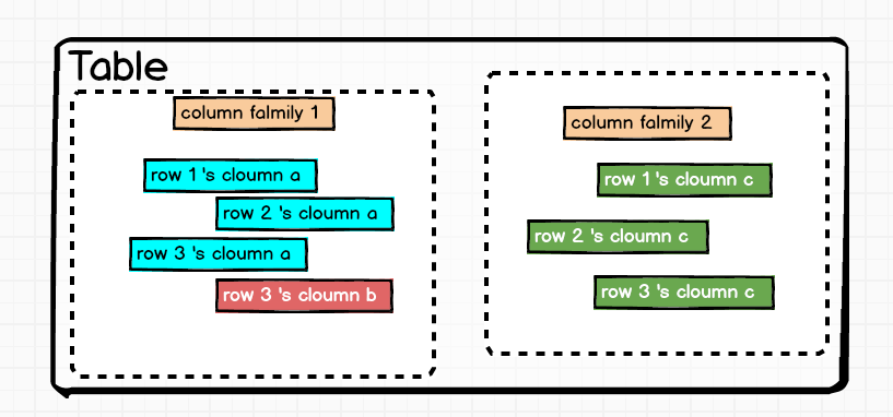 一个行包含多个列,这些列通过列族来分类。行中的数据所属的列族从该表所定义的列族中选取,不能选择这个表中不存在的列族。由于HBase是一个