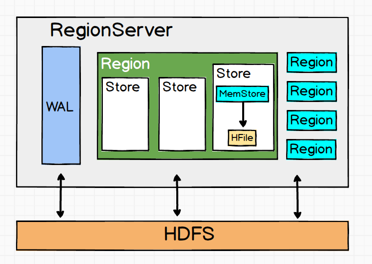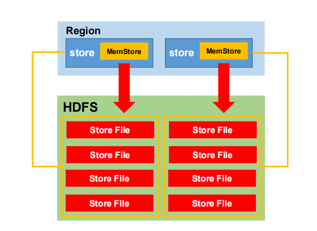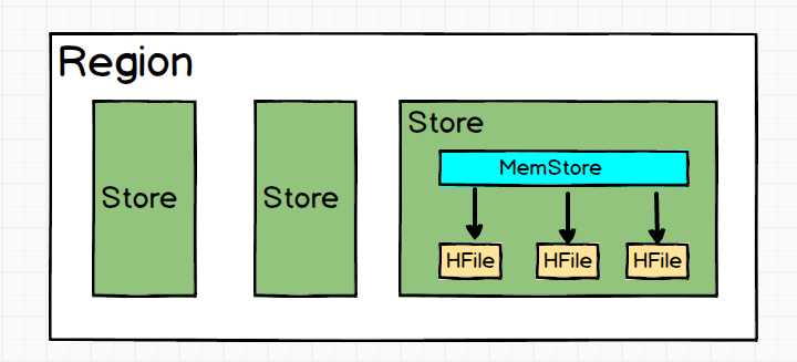 一个Store就是对应一个列族的数据,如图就有三个列族。再从最后一个Store中我们又可以看出,Store是由MemStore和HFile组成的。