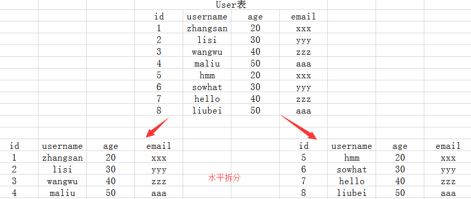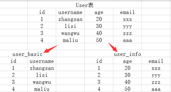 这样的情况下,我们要查找username的时候只需要查找user_basic表,没有多余的字段,查询效率就会很快。如果一张表的 行过多,会影响查询效率,我们将这样的表称之为 高表,可以采用 水平拆表的方式提高效率: