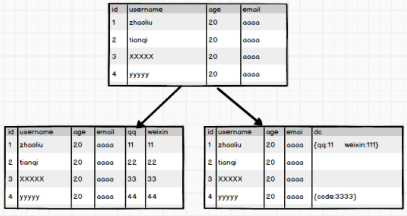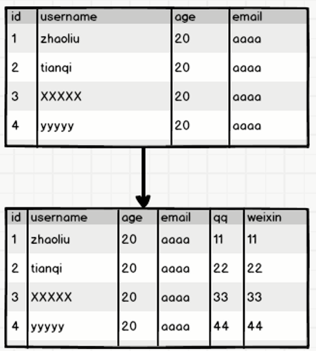 ok,这种拆分方式貌似可以解决宽表和高表的问题,但是如果有一天公司的业务变了,比如原来没有微信,现在有了微信,需要加入用户的微信字段。这时候需要改变表的结构信息,该怎么办?最简单的想法是多加一列,像这样: