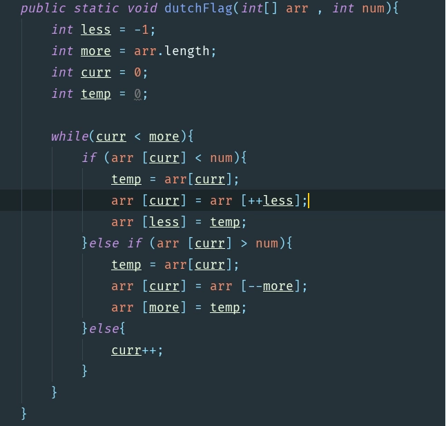 当arr[curr] < num 的时候, less区域的下一个数和arr[curr]交换。然后less右移一个位置,