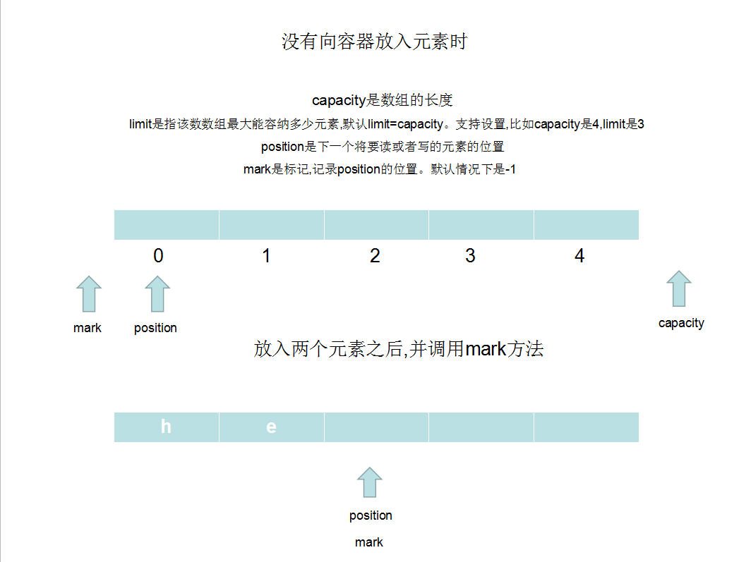 我们主要以ByteBuffer为例来介绍,Buffer的相关操作。对于容器来说我们比较关心的就是两个: