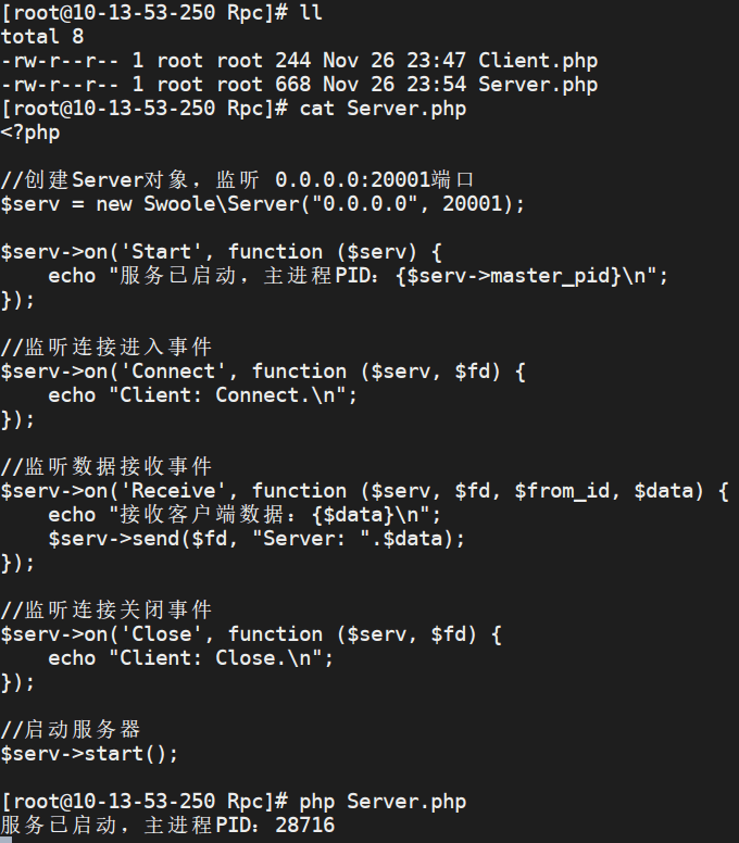 echo "服务已启动,主进程PID:{$serv->master_pid}\n";