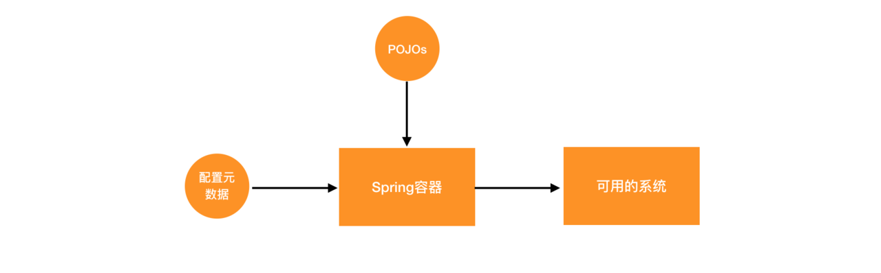 很难精确的使用语言去描述什么是 Spring 容器。Spring 容器就像是一台机器,你需要往里放两种原料,然后这台机器就能把你想要的系统给你生产出来。两种原料一种是业务类(POJOs)和配置数据。就像下面这个图所示: