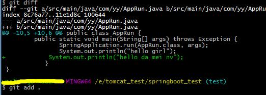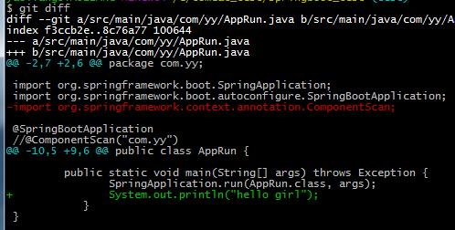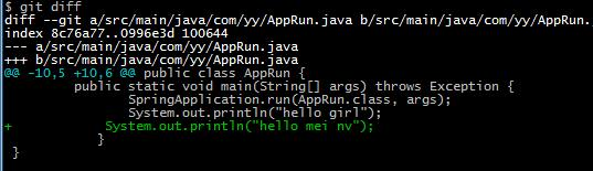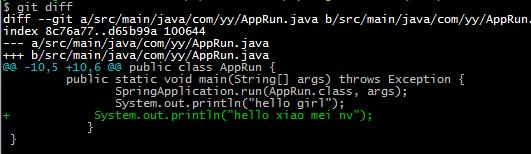 然后,执行git diff命令(他的用法后面有介绍)查看不同点。可以看到刚刚在intellij中加的代码:红色表示删除,绿色表示新增