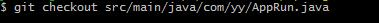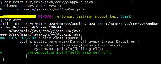 现在不想要新加的代码了,需要回退index区和workspace区。执行git reset src/main/java/com/yy/AppRun.java,之后执行git diff