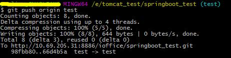下一步就要把代码推到远程库了。执行:git push origin test后,显示下图信息,代码就推到远程库了,你的同事就可以欣赏到你的艺术代码了
