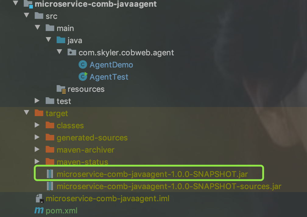 将microservice-comb-javaagent打成jar包。运行时会使用这个Jar包.打包命令:mvn clean package。结果如下图