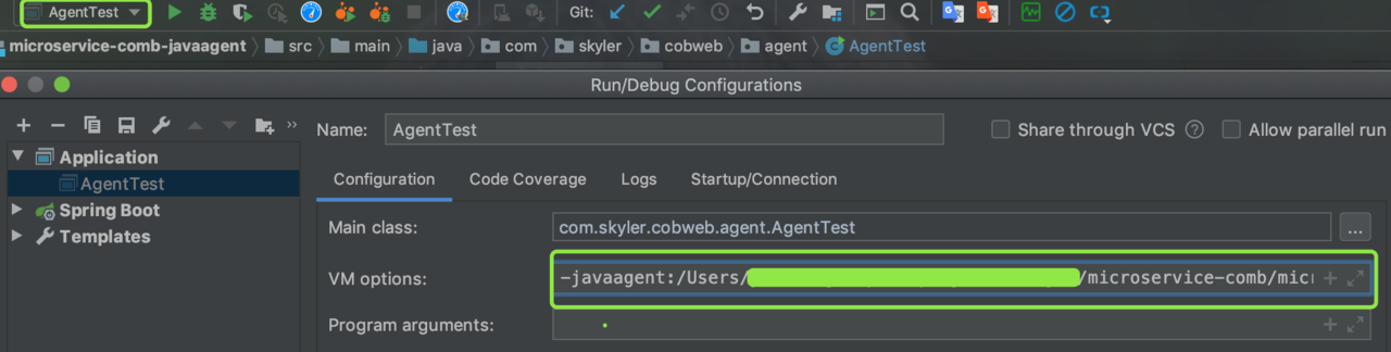 需要配置下项目的运行配置的VM options,如下图,形式为-javaagent:jarpath[=options]; 我的内容为:-javaagent:/Users/xx/microservice-comb/microservice-comb-javaagent/target/microservice-comb-javaagent-1.0.0-SNAPSHOT.ar="hello world"