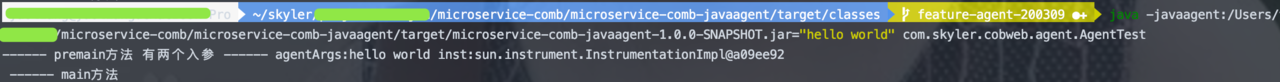 $ java -javaagent:/Users/xx/microservice-comb/microservice-comb-javaagent/target/microservice-comb-javaagent-1.0.0-SNAPSHOT.jar="hello world" com.skyler.cobweb.agent.AgentTest