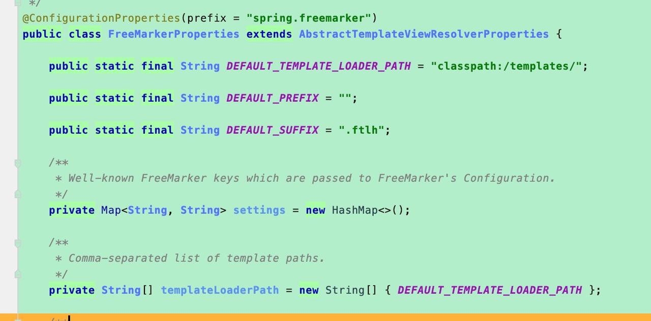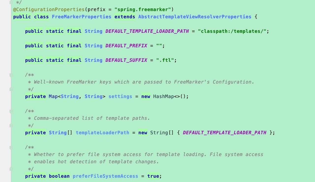 有了想法,现在就要去实现。我们配置的关于FreeMarker的配置,其实是设置到了FreeMarkerProperties这个类里,我们只要在启动的时候改变这个类的属性就好了。