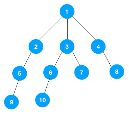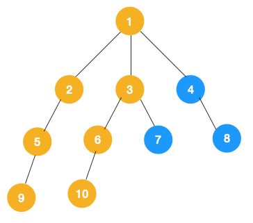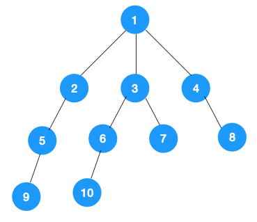 上文所述树的广度优先遍历动图如下,每个节点的值即为它们的遍历顺序。所以广度优先遍历也叫层序遍历,先遍历第一层(节点 1),再遍历第二层(节点 2,3,4),第三层(5,6,7,8),第四层(9,10)。