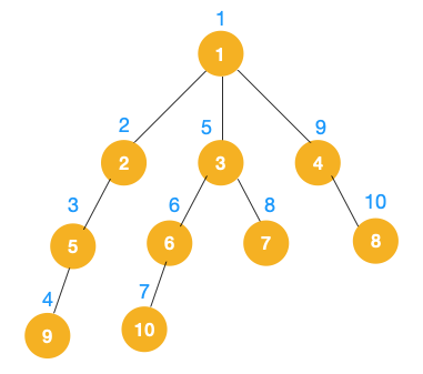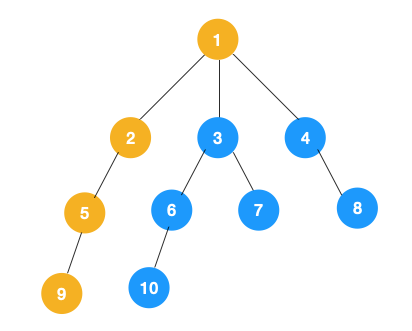 1、我们从根节点 1 开始遍历,它相邻的节点有 2,3,4,先遍历节点 2,再遍历 2 的子节点 5,然后再遍历 5 的子节点 9。