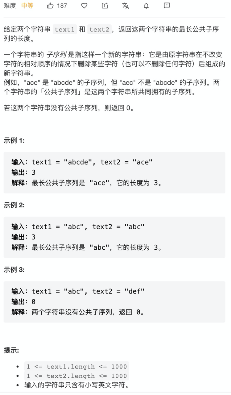 for (int i = 0; i < m; i++) { for (int j = 0; j < n; j++) { // 获取两个串字符 char c1 = text1.charAt(i), c2 = text2.charAt(j); if (c1 == c2) { // 去找它们前面各退一格的值加1即可 dp[i + 1][j + 1] = dp[i][j] + 1; } else { //要么是text1往前退一格,要么是text2往前退一格,两个的最大值 dp[i + 1][j + 1] = Math.max(dp[i + 1][j], dp[i][j + 1]); } } } return dp[m][n]; } }