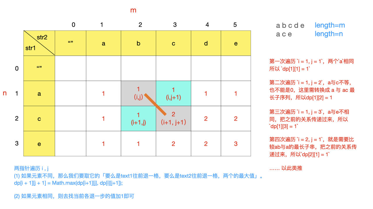 对于 text1:abcde 和 text2:ace 两个字符串,我们定义两个指针进行遍历 i 和 j。