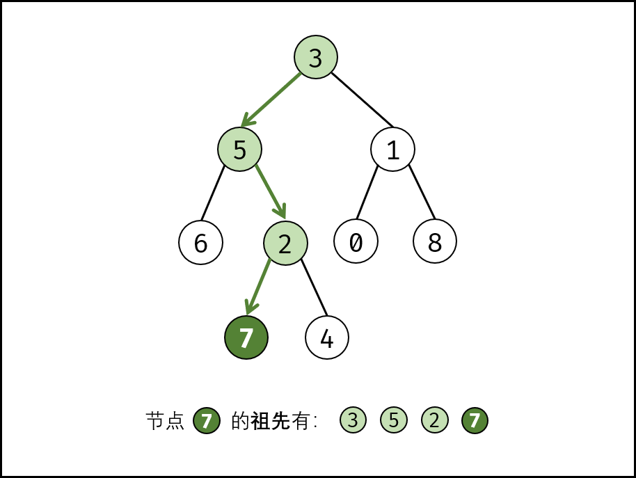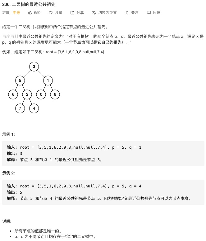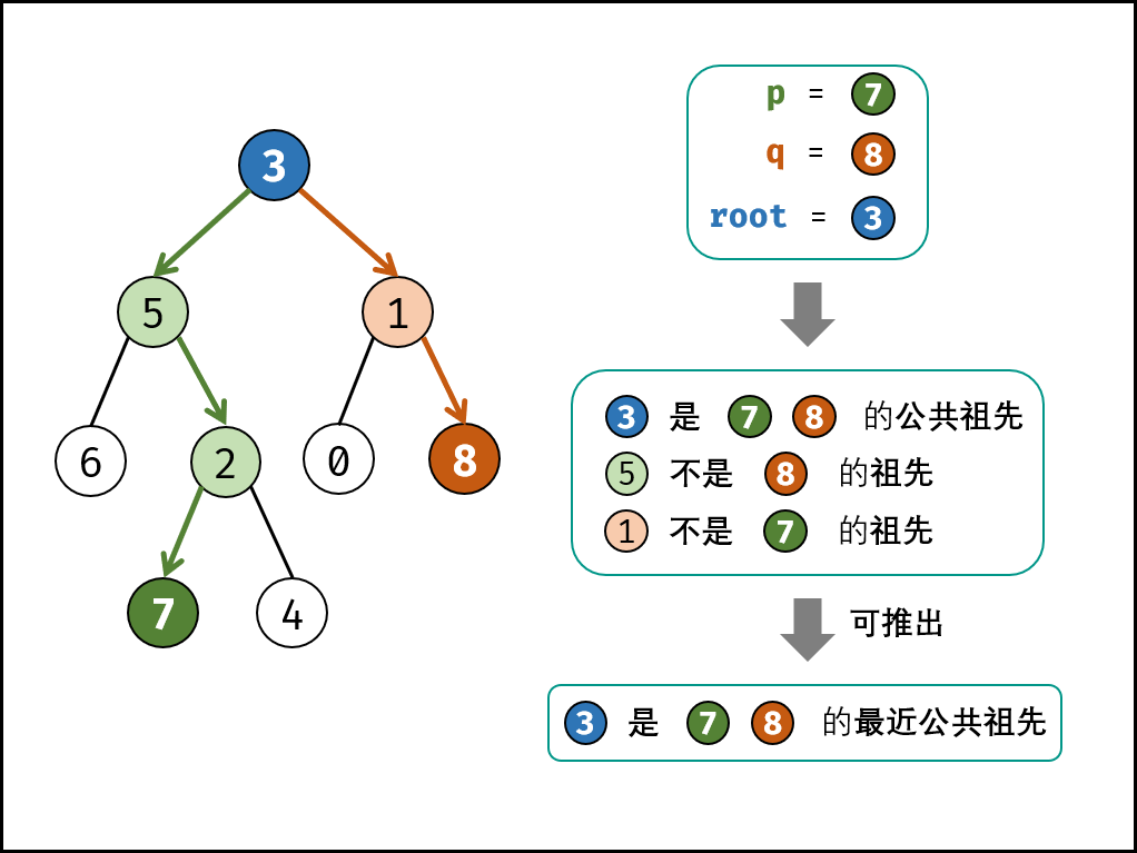 考虑通过递归对二叉树进行后序遍历,当遇到节点 p 或 q 时返回。从底至顶回溯,当节点 p、q 在节点 root 的异侧时,节点 root 即为最近公共祖先,则向上返回 root。