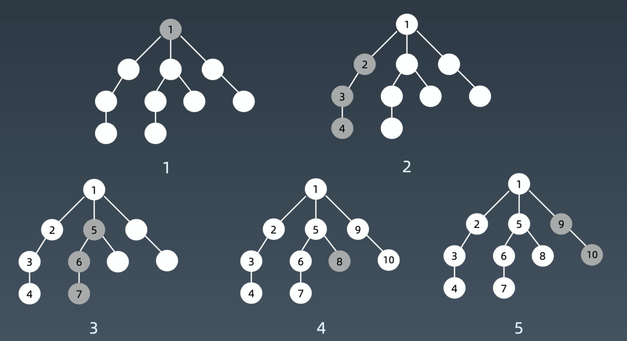我们看深度优先搜索或者深度优先遍历的话,它的整个遍历顺序毫无疑问根节点 1 永远最先开始的,接下来往那个分支走其实都一样的,我们简单起见就是从最左边开始走,那么它深度优先的话就会走到底。