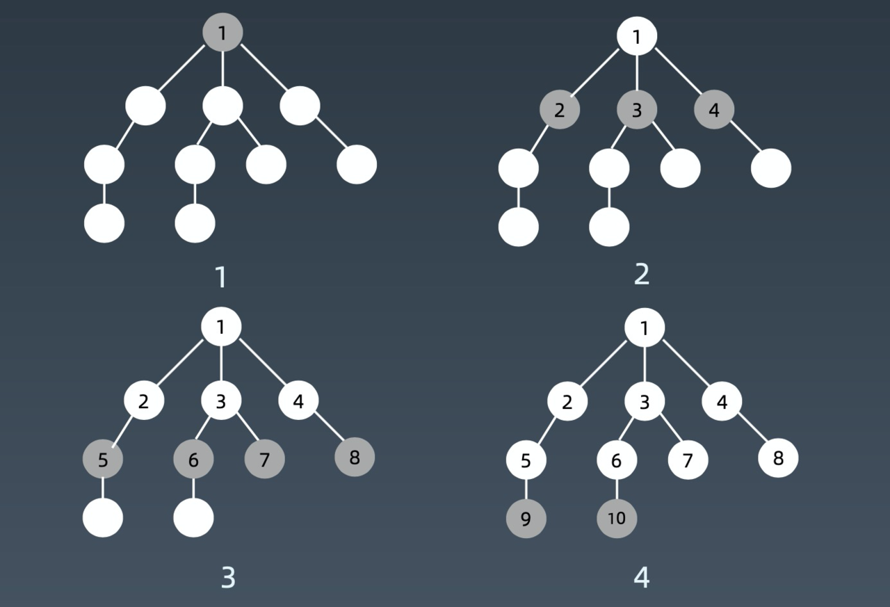 广度优先遍历它就不再是用递归也不再是用栈了,而是用所谓的队列。你可以把它想象成一个水滴,滴到1这个位置,然后它的水波纹一层一层一层扩散出去就行了。