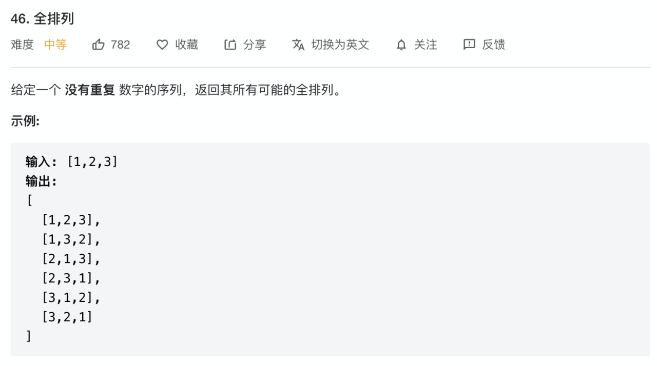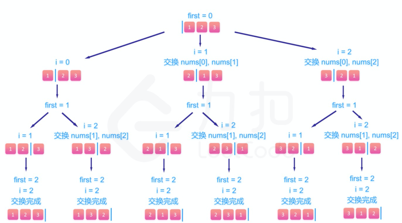 ArrayList<Integer> track = new ArrayList<Integer>(); for (int num : nums) track.add(num); int n = nums.length; backtrack(n, track, 0); return res; } private void backtrack(int n, List<Integer> track,int first) { // 所有的都填完了 if (first == n) { res.add(new LinkedList<>(track)); return; } for (int i = first; i < n; i++) { // 动态维护数组 Collections.swap(track, first, i); // 进入决策树下一层 backtrack(n, track, first + 1); // 撤销操作 Collections.swap(track, first, i); } } }
