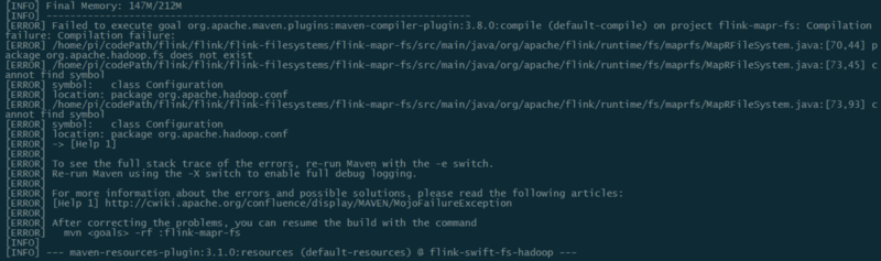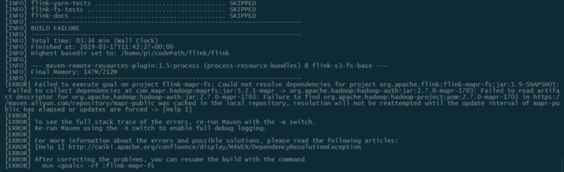 这种错误一般都和 mapr 相关的依赖包的下载失败有关,在实际测试时,即使配置了之前说的 aliyun 代理的 mapr-releases 镜像,还是可能出现下载失败的情况,问题可能还是和 mapr 的 jar 包比较大,容易下载失败有关。 遇到这些问题时,重试即可。在重试之前,要先根据失败信息删除 maven local repository 中对应 的目录,否则需要等待 maven 下载的超时时间才能再次出发下载依赖到本地。